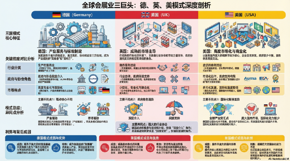 德国、英国和美国作为全球会展业的三大核心力量,其发展的确各具特色。如果把这种总体特点称为“模式”,那么总的来说,德国模式强调“产业服务”与“标准制定”,是制造业的“加速器”;英国模式则体现为···